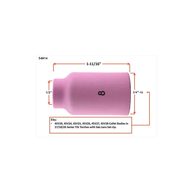 High-Quality Alumina Ceramic Cups / Nozzles for TIG Welding Torches Series 17, 18 and 26 with Gas Lens Set-Up Compatible with all major brands of TIG Torches Series 17, 18 and 26. Available Sizes: #4 (1/4"), #5 (5/16"), #6 (3/8"), #7 (7/16") , #8 (1/2") and #12 (3/4") - Available Packages: 5 PACK and 10 PACK. Select your option from the menu. These Cups are used in in 17, 18 and 26 Series TIG Torches with Gas Lens Set-Ups. They will NOT fit torches with Standard, Large Diameter Gas Lens or Stubby Set-Ups. ***Please make sure your TIG torch is 17, 18 or 26 Series with Gas Lens Set-Up. Check all the pictures for sizes and compatible accessories***