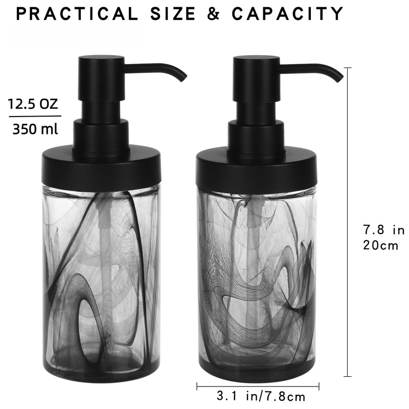 - STYLISH WHITE MARBLE GLASS DESIGN👍: Unique black marble glass design, like ever changing cloud floating in the clear glass, elegant and attractive. Modern soap and lotion dispenser set will add charm to your bland bathroom or kitchen sink decor! Also good for boho farmhouse, luxury hotel, office, B&B use.
