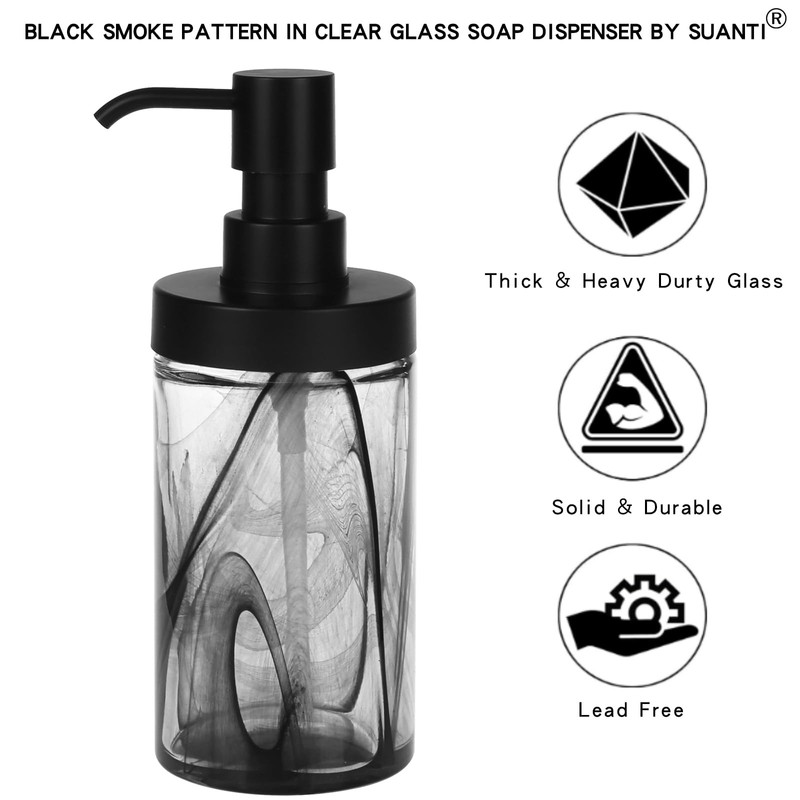 - SOLID&DURABLE QUALITY👍: Hand-blow suanti thick glass soap dispensers set is very well made from high quality glass material, lead free, solid and sturdy. Equipped with matte black pump head that BPA free and Rust-Free. Smooth presses. Safe for all kind of family liquid use.
