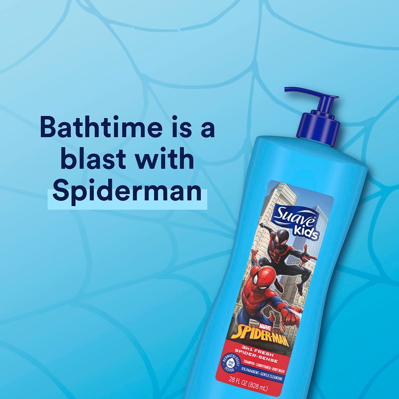 Suave Kids makes bath time a crime-fighting adventure with Marvel Spider-Man! Now your kids are fresh and ready to take on the day with Spider-Man. Suave Kids Spider-Man Fresh Spider-Sense 3 in 1 Shampoo Conditioner Body Wash is the best shampoo 3 in 1 for kids looking for some fun! It cleans hair while leaving skin soft and smooth - all in one simple step. Made with fun, fresh scents that will leave your kids clean from head to toe and smelling great. This kids shampoo is Dermatologist tested and Ophthalmologist tested to help make bath time tear-free. Moms and Dads will love Suave for Kids because it makes bath time effortless with an easy-to-use pump bottle. We've designed a kid shampoo, conditioner, and body wash to make shower or bath time fun, playful, and clean. Enjoy fun scents inspired by Spider-Man; Crime Fighter Clean and Fresh Spider-Sense. These kids hair products and body wash items will get your kids excited for bath time with awesome fragrances they will love. To use, just wet hair and skin and work into a creamy lather on hair/scalp and body. Rinse well. Suave Kids Spider-Man 3 in 1 shampoo, conditioner, and body wash is perfect for everyday use. Suave Kids offers a range of hair products and skin products designed specifically for kids. Try our Silly Apple hair detangler to smooth out knots, or our Purely Fun 3-in1 kids shampoo, conditioner and body wash.