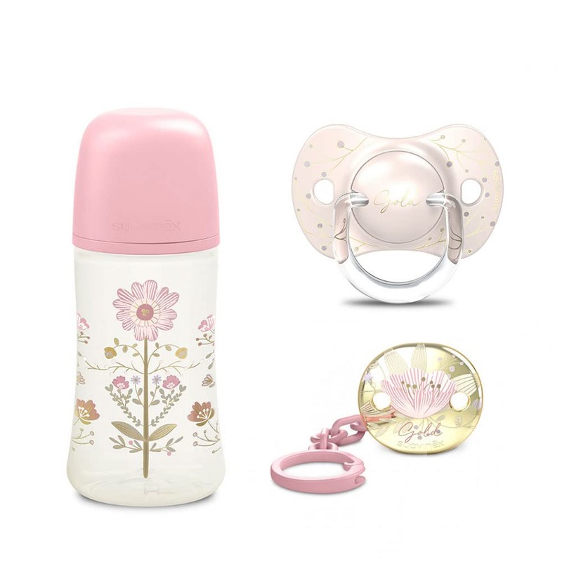 Suavinex, Gold Edition Gift Set Bottle 270 ml + Dummy 0-6 m + Clip, Pink