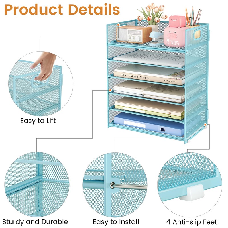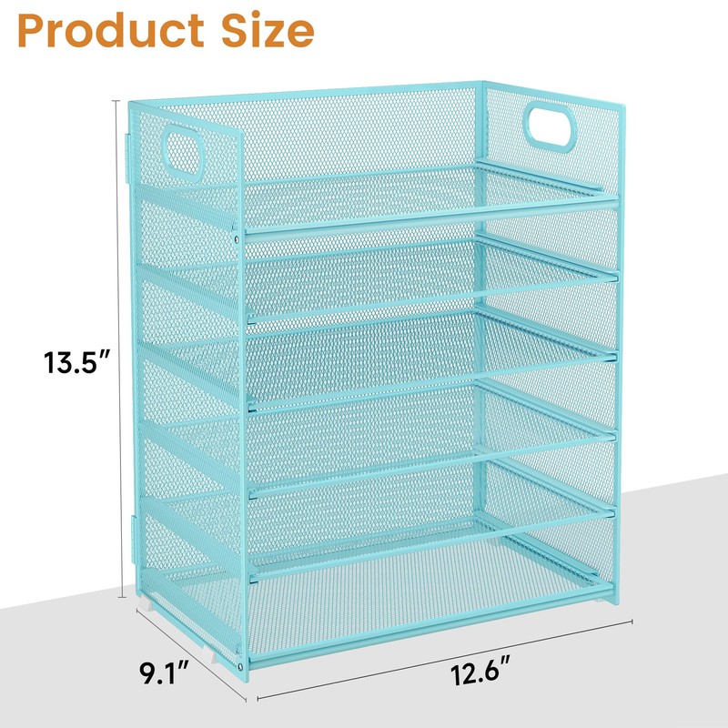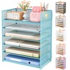 Subekyu 6 Tier Office File Paper Desk Tray Organizer with Handle, Stackable Slid Tray, Mesh Letter Tray Folder Blue Desk Organizer, Desktop Document Sorter for Classroom, Office, Home Supplies Storage