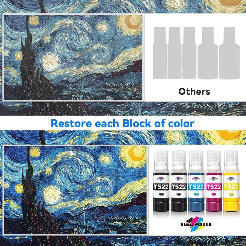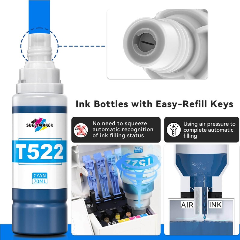 SUBLIMAKER 522 Ink Refill Bottles for Ecotank ET-2720 ET-2800 ET-2803 ET-4800 ET-2400 ET-4700 ET-2840 ET-4810 Printers, High Performance T522 522 Ecotank Printer Ink Refill