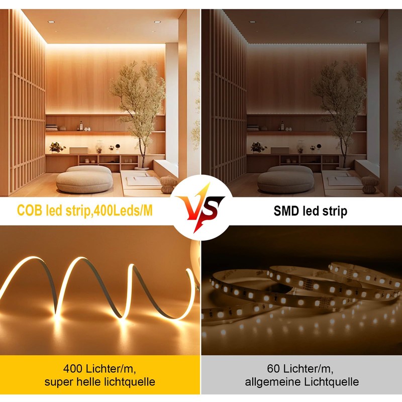 - LED strip upgraded design: 2000LEDs/5M, 400LEDs/M, 10W/M, the light beads on the circuit board are denser, compared to 5050 SMD LED strip lights, COB LED strips are not LED spots, the COB LED strip light is even, bright, soft, more complete and uninterrupted