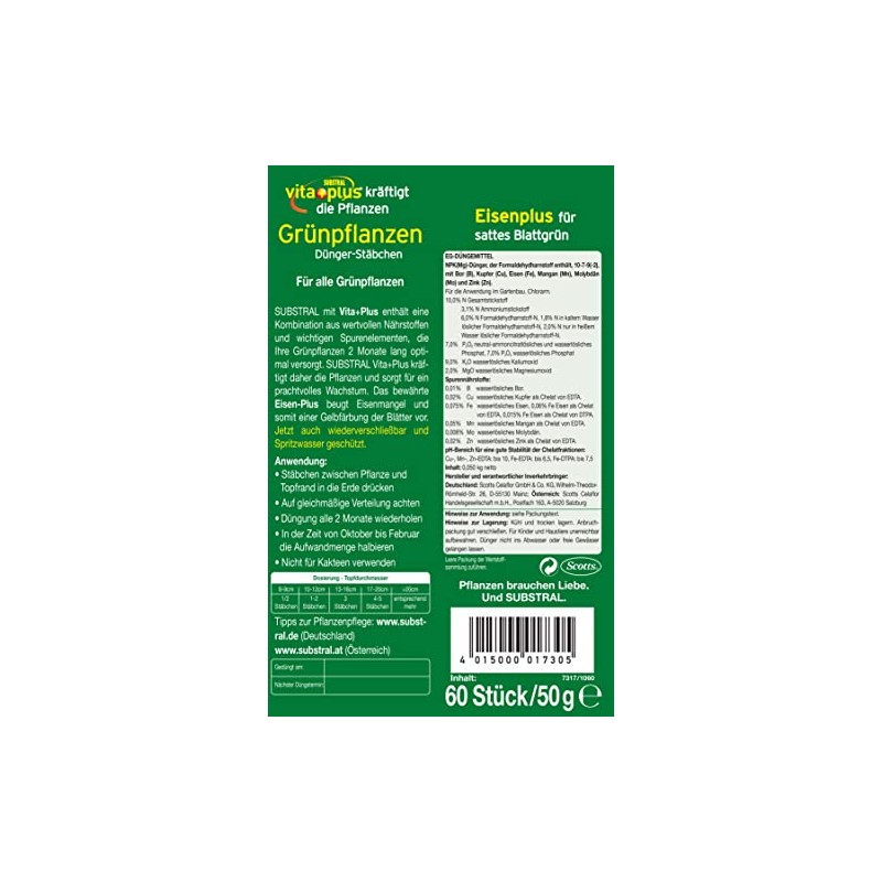 ProduktbeschreibungBeschreibungSubstral Grünpflanzen Dünger-Stäbchen enthalten eine Kombination aus wertvollen Nährstoffen und wichtigen Spurenelementen, die Ihre Grünpflanzen 2 Monate lang optimal versorgt. Substral Vita+Plus kräftigt daher die Pflanzen und sorgt für ein prachtvolles Wachstum. Das bewährte Eisen-Plus beugt Eisenmangel und somit einer Gelbfärbung der Blätter vor. Chloridarm.AnwendungAnwendungszeit: Januar - DezemberStäbchen zwischen Pflanze und Topfrand in die Erde drückenAuf gleichmäßige Verteilung achtenDüngung alle 2 Monate wiederholenIn der Zeit von Oktober bis Februar die Aufwandmenge halbierenInhaltsstoffeNPK(Mg)-Dünger mit Formaldehydharnstoff, 10-7-9(-2), mit SpurennährstoffenGebrauchsanweisungTopfdurchmesser: 8 bis 9 cm 1/2 Stäbchen 10 bis 12 cm 1 bis 2 Stäbchen 13 bis 16 cm 3 Stäbchen 17 bis 20 cm 4 bis 5 Stäbchen über 20 cm entsprechend mehr Stäbchen zwischen Pflanze und Topfrand in die Erde drücken. Auf gleichmäßige Verteilung achten. Düngung alle 2 Monate wiederholen. In der Zeit von Oktober bis Februar die Aufwandmenge halbieren. Für Orchideen bitte SUBSTRAL Orchideen Dünger-Stäbchen verwenden Bitte beachten Sie, dass es hier um eine gekürzte Anleitung handelt. Die vollständige Produktbechreibung und Anleitung finden Sie oben in den Bildern oder direkt am Produkt.WarnhinweiseAchtung: Darf nicht in die Hände von Kindern gelangen! Hinweise beachtenAnschrift Hersteller/ImporteurWilh.-Theodor-Römheld-Str. 30, D-55130 Mainz