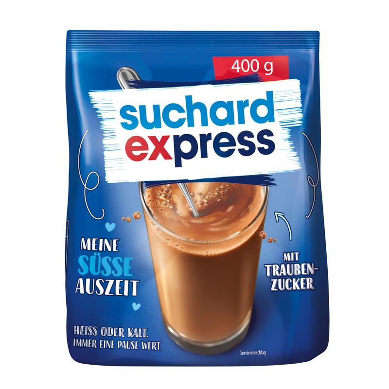 - Zubereitung: 2-3 Teelöffel (ca. 20 g) Suchard Express in 200 ml beliebige Milch (kalt oder warm) rühren – fertig.