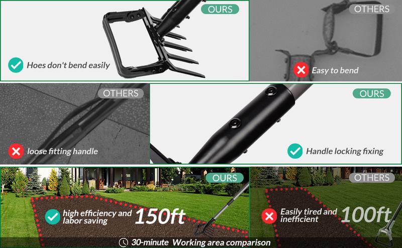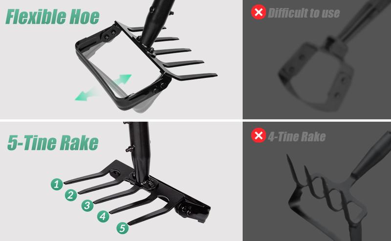 - Featuring an adjustable handle that extends from 37 to 82 inches and a flexible rake head with 5 tines, this tool caters to various body types and gardening tasks without the need for bending, protecting your waist and knees.