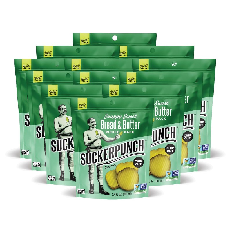 SuckerPunch Snappy Sweet Bread N’ Butter Dill Pickles Chip-Cut, Gluten Free, Kosher, Sugar Free, Low Calorie, Low Carb, on the Go, Non GMO, Keto Friendly, Vegan, 3.4 Oz Single Serve Pouch (12 Pack)