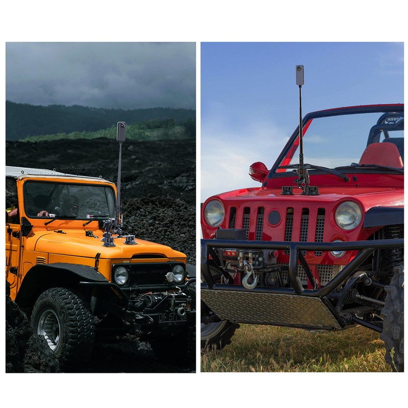 - Wide applications : Our 3 in 1 strong suction car mount holder securely attaches to car hoods, windshields window, top roof, trunk lid or a any smooth and flat surface. Allowing you to capture the ultimate panoramic video footage