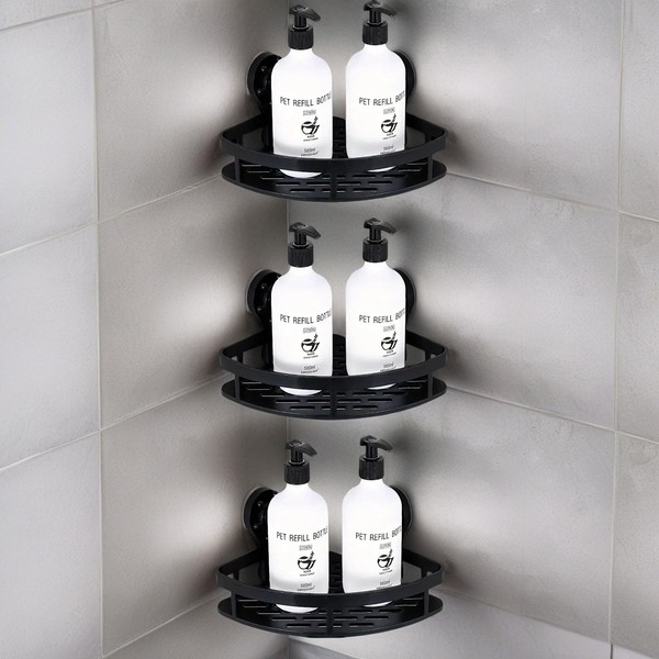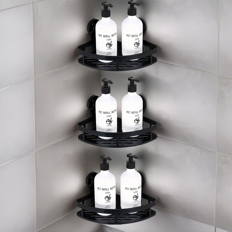 Suction Cup Shower Shelf (2-Tier & 3-Tier), Black Triangular Corner Bathroom Rack, No-Drill, Rustproof, Holds up to 10kg (3-Tier))