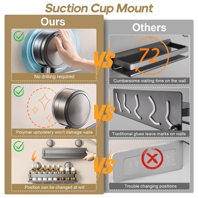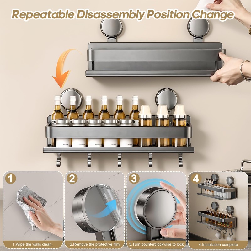 - EASY AND TRACELESS INSTALLATION: The spice rack comes with strong suction cups, no tools needed, just simply rotate the suction cups to pull out the air, then it can be firmly adsorbed on the wall. It can be disassembled without any trace and change the position at will without damaging the wall, perfectly adapting to the needs of various families and kitchen layouts