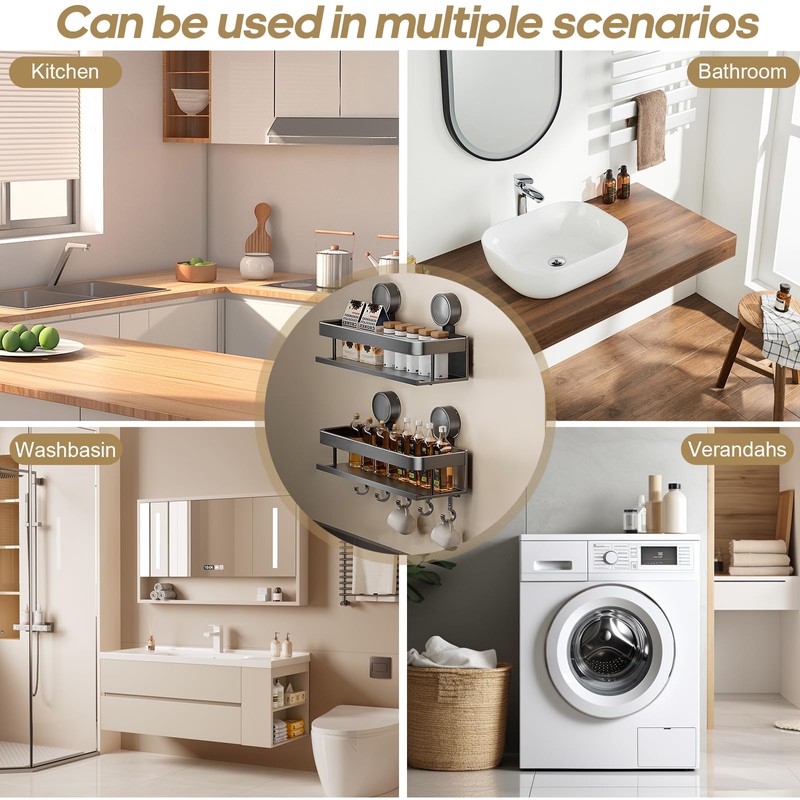 This 2-piece spice rack set, equipped with hooks and hanging rods, features innovative and powerful suction cup technology with a weight capacity of up to 44 pounds(Holds up to 22 lbs. each), ensuring that items are stable and won't fall off. The super strong suction not only provides more peace of mind and long-lasting use, but also organizes and stores various sizes of spice bottles, spatulas, rags, snacks, etc., bringing convenience and safety to your kitchen.