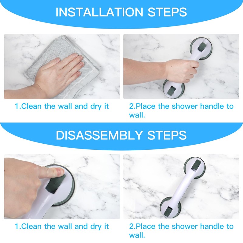 3. The shower grab bars work well on smooth tile, marble & stainless steel & glass, plastic, acrylic.