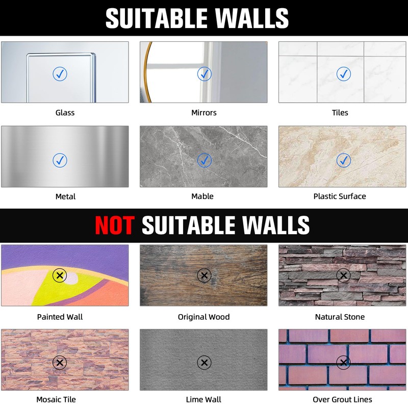- 【Widely Used】The vacuum suction cup hook can be firmly adsorbed on clean and smooth surfaces such as tiles, marble, glass, mirrors, metal, plastic, lacquered wood, etc. It is suitable for bathrooms, kitchens, living rooms, bedrooms, offices, etc. Note: Not suitable for lime walls, painted walls, wallpaper, original wood, etc., with dusty, uneven surfaces.