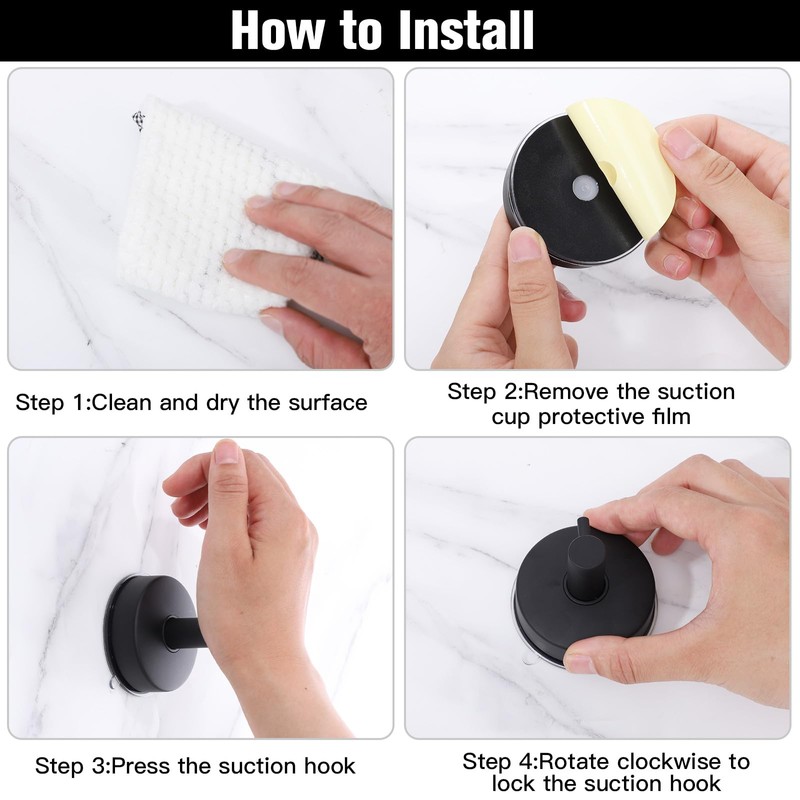 - 【Easy to Install】After cleaning and drying the area to be pasted, just tear off the suction cup protective film, press the suction cup hook against the wall, press hard for a few seconds to expel the air, and then turn the suction cup hook clockwise to lock. No drilling, no screws or other tools are required, the installation operation is very simple.