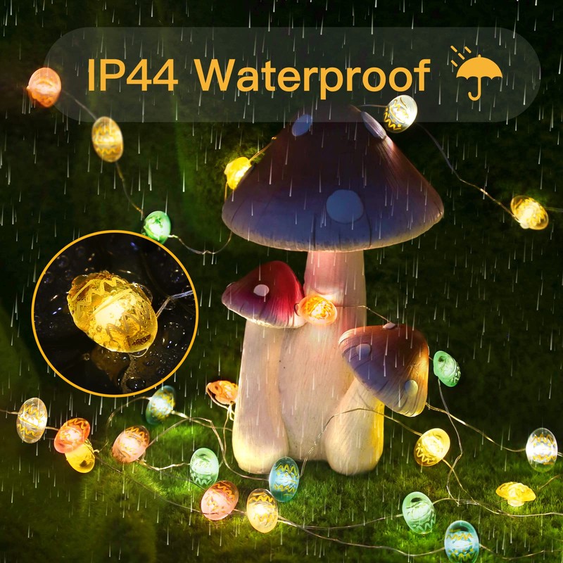 - 🥚[Safe & Waterproof]: Easter string lights with remote are low heat emission and safe to touch. Moreover, the Easter lights are IP44 waterproof, which means they can stay bright in any weather, such as rain, wind, and snow. Compared with other products, the battery box is also waterproof.