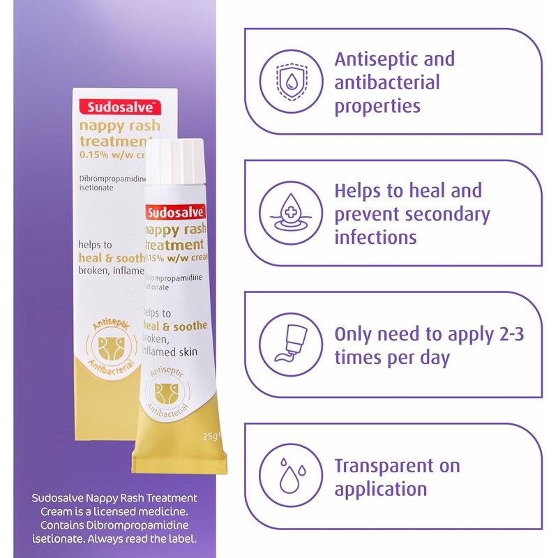 Sudosalve™ Nappy Rash Treatment Cream is specially formulated to soothe and heal broken and inflamed skin caused by nappy rash. This antiseptic cream contains antibacterial properties that help kill certain types of bacteria and fungi, preventing secondary infections. Its transparent formula glides easily over the skin, reducing discomfort and irritation, and ensuring gentle application. Sudosalve™ is designed for use 2-3 times a day, helping to heal and protect your baby’s skin from the first signs of nappy rash.