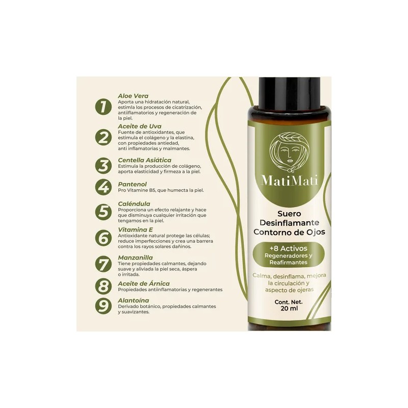 El Suero Desinflamante para Contorno de Ojos de Matimati de 20ml es un tratamiento natural con más de 8 activos desinflamatorios y calmantes como manzanilla y centella asiática. Mejora la circulación para reducir la apariencia de ojeras por cansancio y previene el envejecimiento prematuro. Su fórmula es vegana, sin crueldad animal, libre de alcohol, fragancias y parabenos, y es apta para todo tipo de piel. ✨