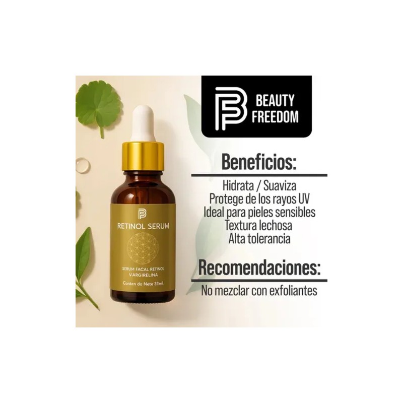 Con un volumen de 35 ml, el Sérum Retinol de Beauty Freedom es fácil de incorporar en tu rutina diaria. Aplica unas gotas en el rostro y disfruta de una piel más suave, hidratada y rejuvenecida. Ideal para quienes desean cuidar su piel de manera efectiva y natural, este producto se convierte en un aliado indispensable en tu arsenal de belleza.