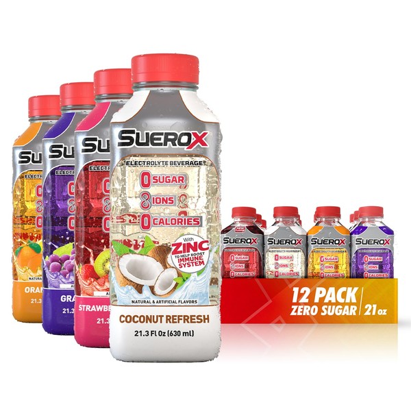 - DELICIOUS FLAVOURS: SueroX Electrolyte Drinks are available in 7 delicious flavors - Coconut, Grape, Blueberry, Strawberry-Kiwi, Orange, Lemon Lime and Berry. They have zero sugar, zero calories, and a unique blend of 8 important ions