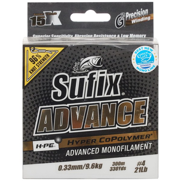 The Sufix Advance H-PE Monofilament is a combination of HMPE and Hyper Copolymer, creating a premium performance line that provides superior abrasion resistance, low stretch and sensitivity that has never been seen before. Unlike other abrasion resistant lines, Sufix Advance is very supple and sensitive, allowing subtle and precision presentations. Having only half the stretch of a standard monofilament line, this line offers exceptional lure control, ultimate bite detection and firm hook setting power. Thanks to its inherent qualities and the Sufix G2 Precision Winding, Sufix Advance H-PE Monofilament is virtually memory free, extremely easy handling and long casting. See for yourself how this line can stand up to big fish and tough conditions.