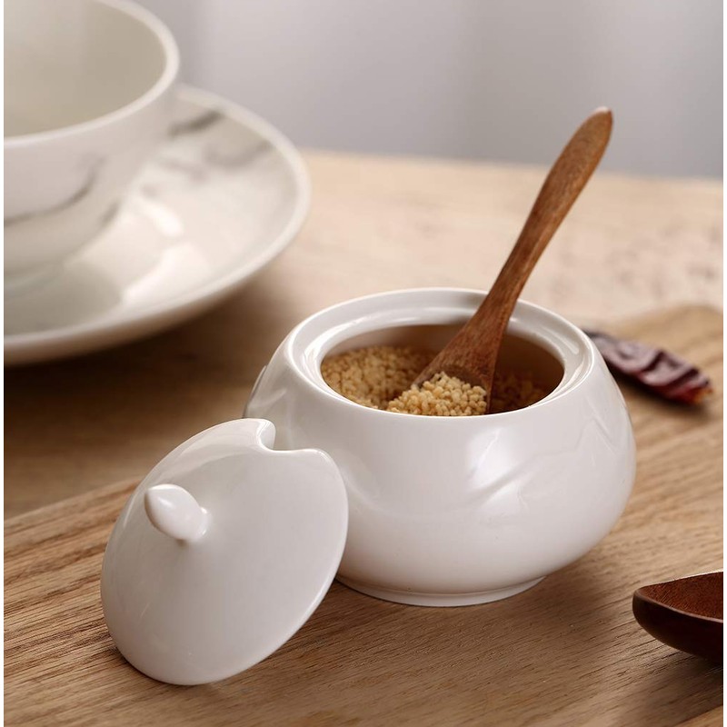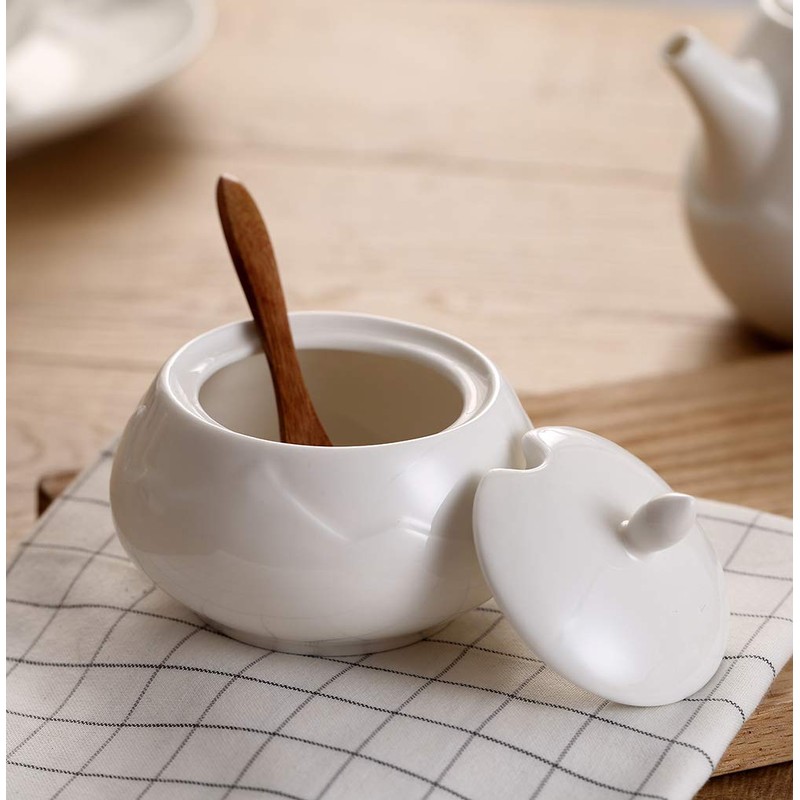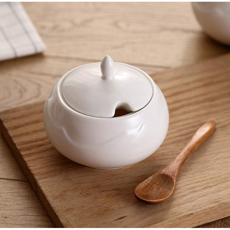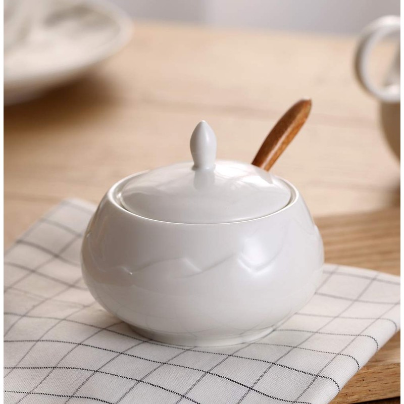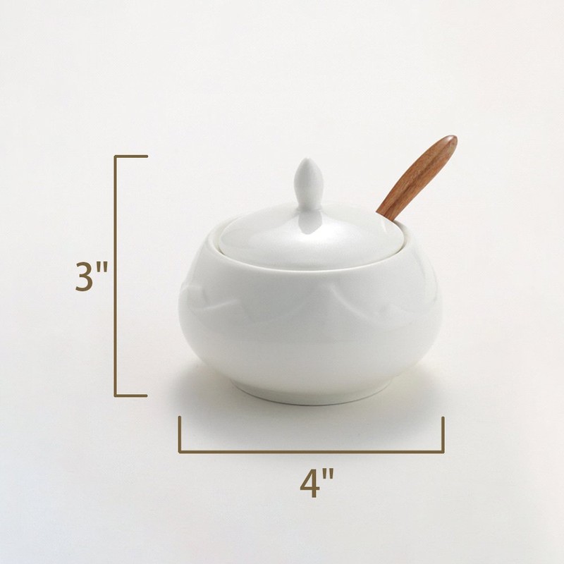 Sugar Bowl, Ceramic Sugar Bowl with Lid and Bamboo Spoon for Home and Kitchen - Mountain Design, White