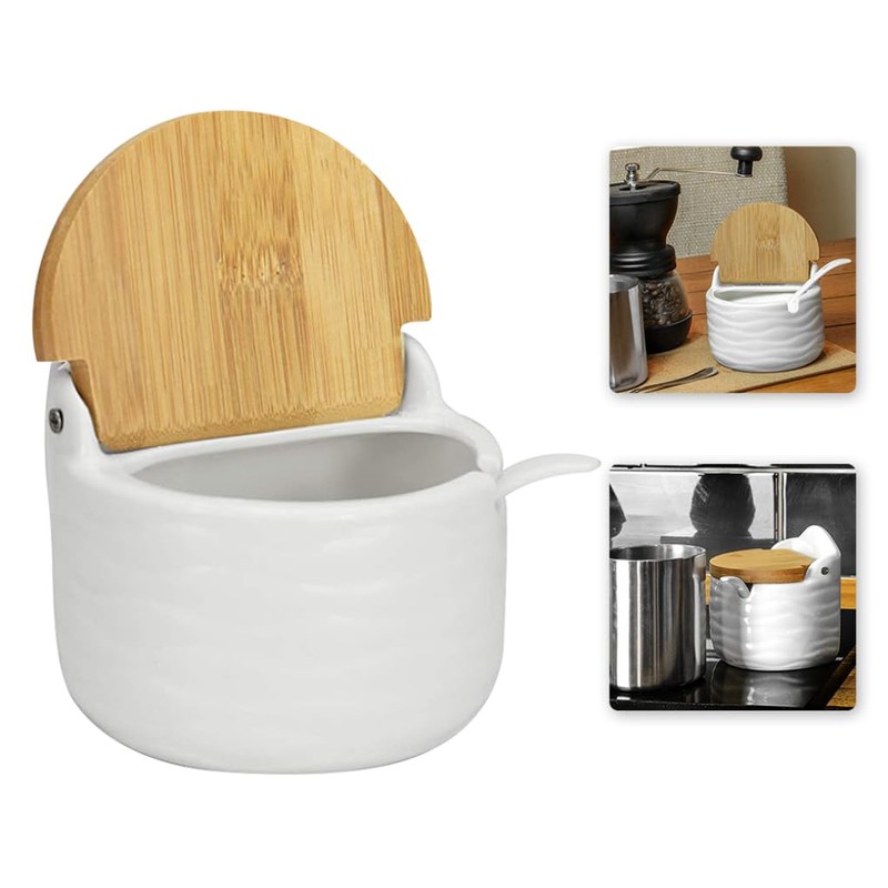 Sugar Bowl Ceramic Sugar Pot Jar Salt Cellar Condiment Pots Tea Caddy Container with Reversible Bamboo with Lids Spoon for Spice White