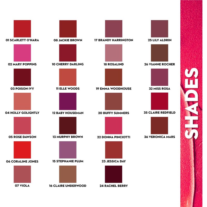 - 36 gorgeous lipstick shades from subtle nudes to rich reds and poppy pinks to suit your taste & your ever-changing mood!