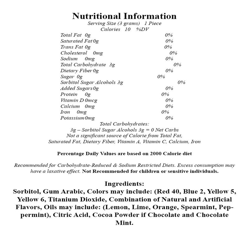 - A Sugar-Free Hard Candy in the Choice of Your Flavor: Banana, Blueberry, Butter Rum, Butterscotch, Cherry, Chocolate, Chocolate Mint, Cinnamon, Creamy Coconut, Coffee, Grapefruit, Grape, Green Apple, Lemon, Lemon Lime, Licorice, Mango, Orange, Peach, Icy Peppermint, Pina Colada, Pineapple, Raspberry, Root Beer, Spearmint, Strawberry., Watermelon, Wintergreen.