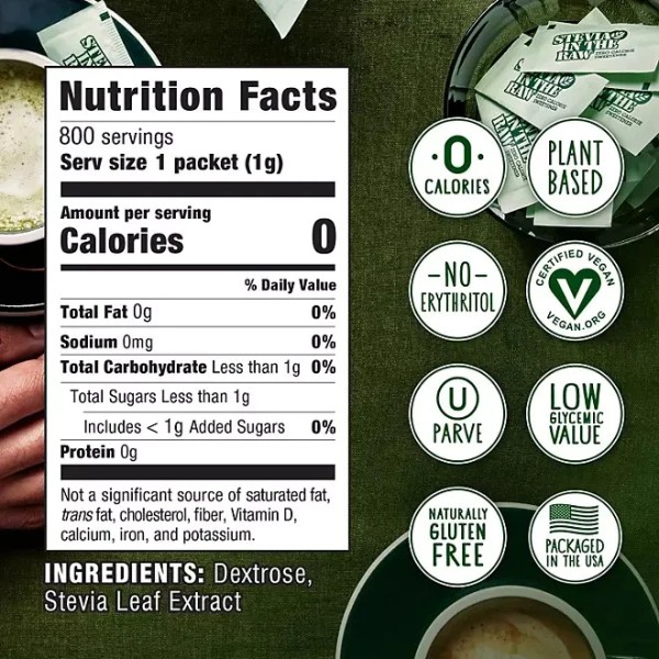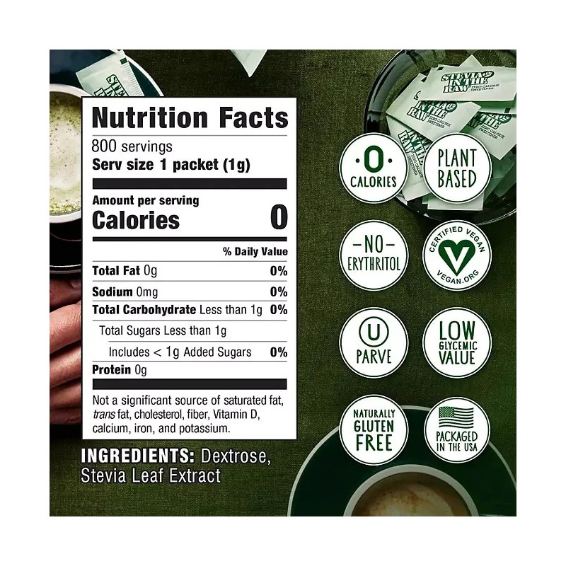 Enjoy sweet moments with Stevia In The Raw Plant-Based Zero Calorie Sweetener Packets, 800 count, 1 pack. This sugar substitute's sweetness is extracted from the leaves of the stevia plant. The delicious sweet flavor comes without any calories and each packet is equal to the sweetness of 2 tsp. of sugar. These packets are single serve so you can conveniently take them on-the-go. They are naturally gluten free, vegan, and low glycemic value. Our stevia packets are perfectly crafted to sweeten hot and cold beverages, or sprinkle on your favorite foods!