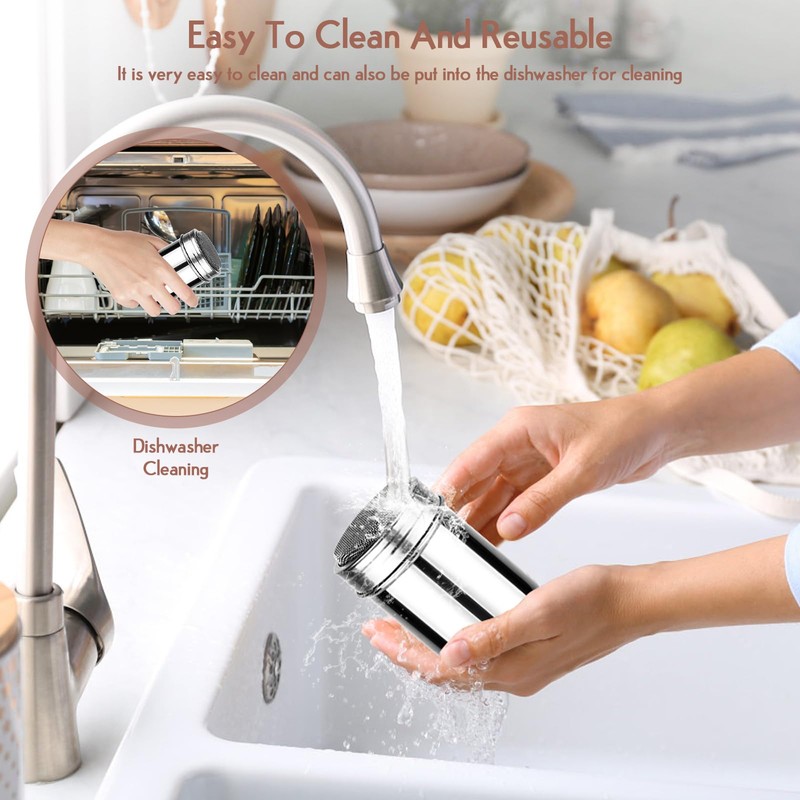- Easy to Clean: Featuring a polished,stain-resistant surface,this shaker is easy to clean by rinsing with water or using a dishwasher.Both the cover and mesh lid are detachable for hassle-free maintenance.