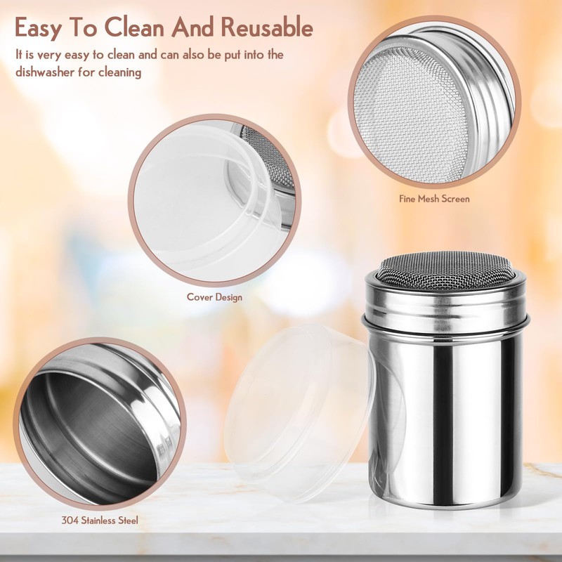 - Food-Grade Safety: Made from high-quality 304 stainless steel,this sugar shaker is food-safe,rust-free,and odorless,ensuring long-lasting use for powdered sugar,cinnamon,cocoa,and more.The fine mesh top ensures even distribution of powders.