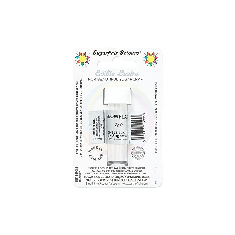 - Sugarflair Snowflake Edible Lustre Dust is versatile and can either be brushed onto cakes and decorations or mixed with rejuvenator spirit to create an eye-catching edible paint for sparkling cakes or glamorous sugar cake decorations.