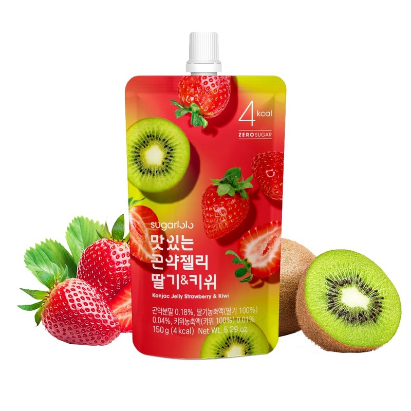 Sugarlolo Konjac Sweet Strawberry & Kiwi Jelly Snack - Vegan Jello with Zero Sugar | Only 4 Calories per Pouch | Low Calorie Korean Snacks | 5.29 Oz (150g) | 10 Pack