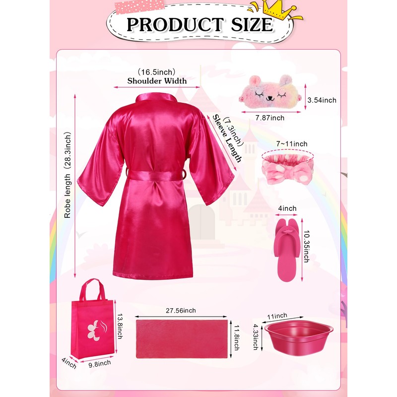 - Cute Spa Robes for Girls: the girls satin kimono robes are made of polyester fiber, not easily deformed or broken; This women's silk bathrobe features a stylish slanted V neck design and 3/4 sleeve; One size fits most kids, girls can freely adjust your short satin robe to the suitable fit