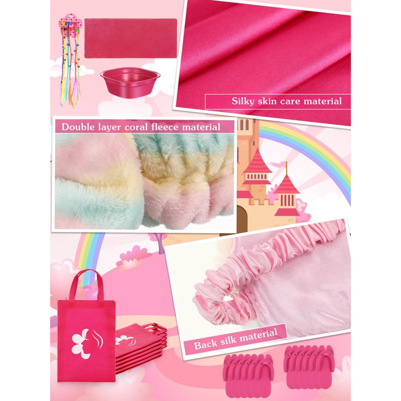 - Package Includes: 95 pieces spa party supplies for girls in total, the package includes 6 pieces kids satin robe, 6 pieces of headbands, 6 pairs of slippers in uniform size, 6 pieces of sleep mask and 6 pieces of tote bags, 20 mini nail clippers, 6 braided wigs set, 6 nail stickers, 6 precision tweezers set, 6 nail art point drill pens, 6 toe splitters, 3 partitioning nail accessories, 6 plastic foot basins and 6 towels