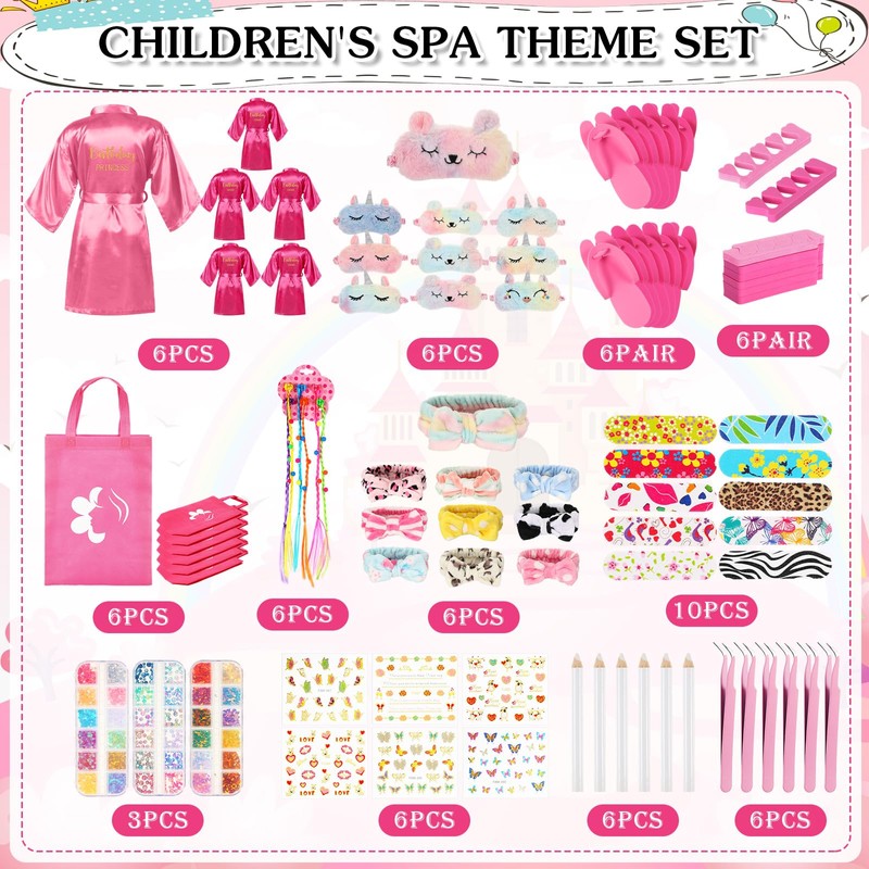 - Package Content: 75 pieces of spa party supplies for girls in total, including 6 kids satin robes that consist of 1 pink robe printed with birthday princess and 5 rose red robes with birthday squad letters, 6 headbands, 6 pairs of slippers in uniform size, 6 sleep eye mask and 6 pieces of tote bags, 20 mini nail clippers, 6 braided wigs, 6 nail stickers, 6 precision tweezers, 6 nail art point drill pens and 1 partitioning nail accessories