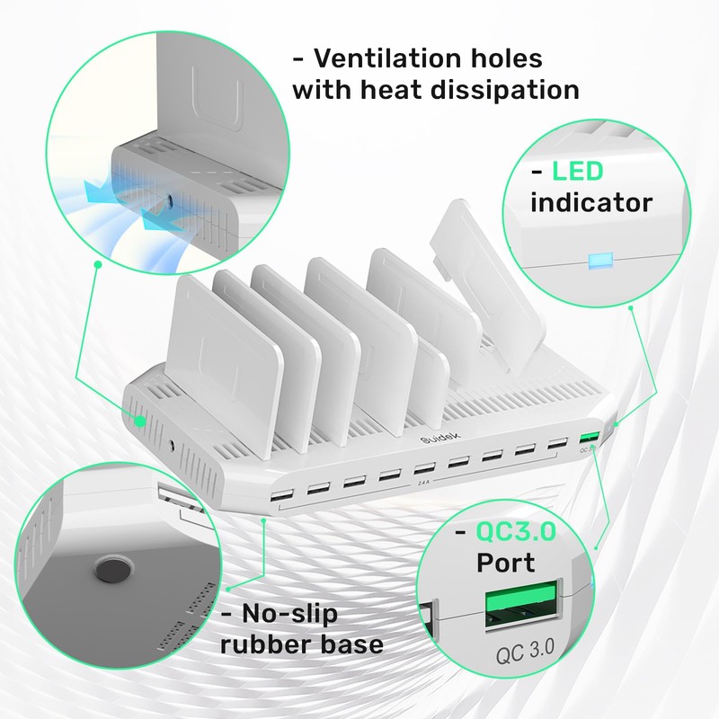 SUIDEK 60W Multiple Device Charging Station for Multiple Devices, 10 Ports USB Charging Station with QC 3.0 Port, USB Charging Dock with Adjustable Dividers Compatible with Tablets, Smartphones