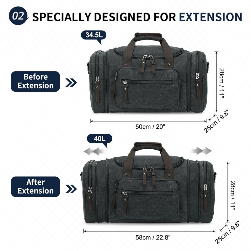 -Expandable Space- --Duffle bag for men measures 20"/50cm (L) x 9.8"/25cm (H) x 11"/28cm(W) and can be expanded up to 23 inches with two side zips. 7 pockets include: 1 main compartment, 1 large front zippered pocket, 1 back zippered pocket, 2 side zippered pockets, and 2 internal pockets. Enough space for comfortable use
