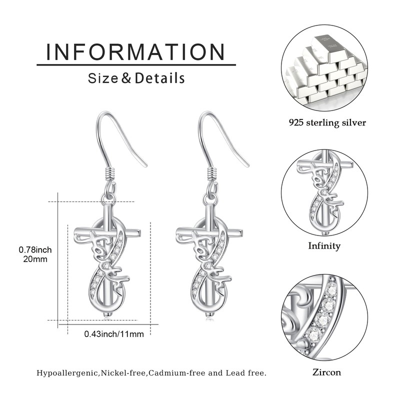 - FAITH DANGLE EARRINGS: The faith earrings for women is made of 925 sterling silver, and shinning cubic zirconia is inlaid on the infinity symbol. Very catch eyeballs, show you something distinguishes in a special occasion, showing women's fascination