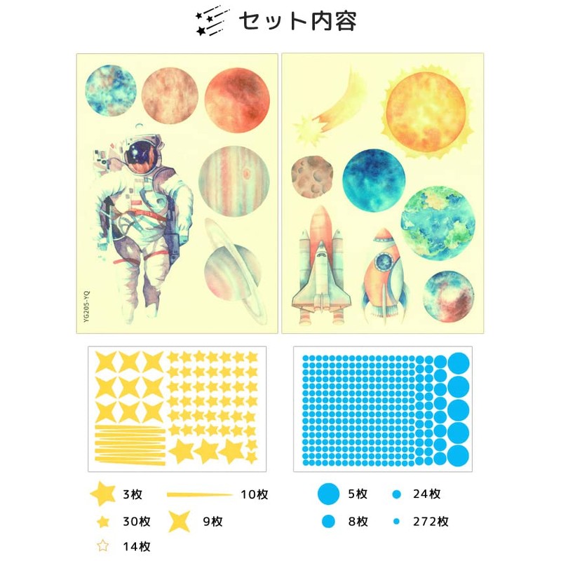 - Size (Approx.): Astronaut 8.3 inches (21 cm), Rocket/5.4 inches (13.7 cm), 4.1 inches (10.5 cm), Planet/Pictures: Meteor (Illustration)/4.1 inches (10.3 cm), Star (Large) 0.6 inches (1.5 cm) Round (Small) 0.4 inches (1 cm). Round (ultra small) / 0.2 inches (0.7 cm)