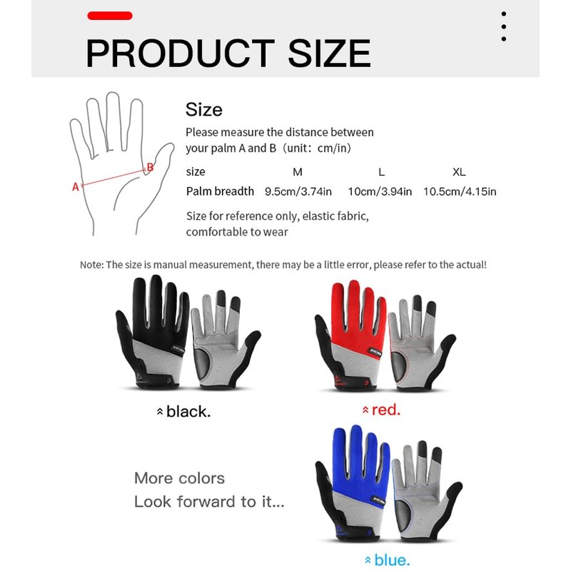 - 100% Satisfaction - Please measure hand width first and check size. Our bicycling gloves are designed with the highest quality materials, if you meet any problems contact us and we’ll help you solve it until you satisfy. We believe in the quality of our mountain bike gloves and strive to improve our bike gloves based on riders' feedback.
