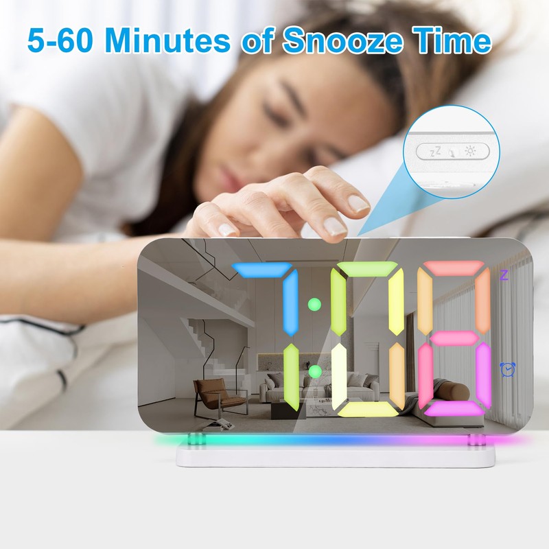 - 【10 Farbmodi Nachtlicht】Die spiegel digitaler wecker verfügt über ein integriertes Atmosphärenlicht mit 3 dynamischen RGB-Farben und 7 festen Farbmodi sowie 5 einstellbaren Helligkeitsstufen, die nachts für Beleuchtung sorgen und Ihrem Schlafzimmer eine tolle Atmosphäre verleihen. Der Nachttisch uhr eignet sich perfekt für ein Spielzimmer, einen Nachttisch, ein Schlafzimmer, einen Wohnbereich und als Schlafzimmerdekoration zu Hause.