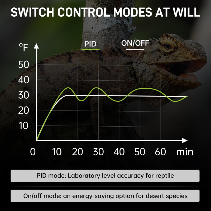 - 🌡️ Smart PID Tech for Delicate Creatures: When your scaly friend needs stability, our reptile temperature controller delivers lab-grade accuracy! ±0°F PID mode eliminates temperature swings (ideal for egg incubation or sensitive chameleons), while ±1-18°F range mode saves energy for desert species. Precision matters – we keep fluctuations under 0.5°C!