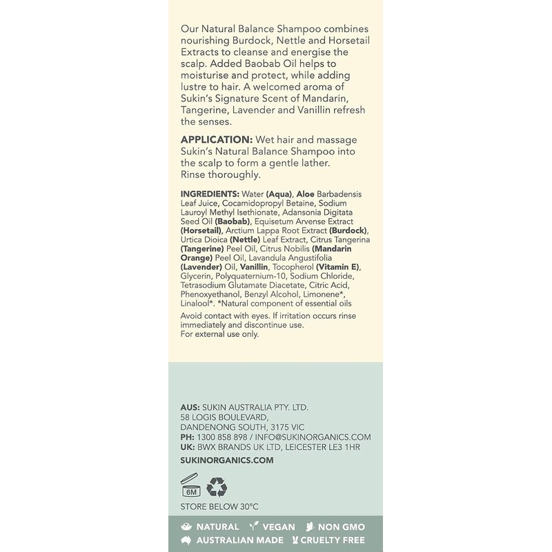 Free from sulphates, silicones, and harsh chemicals that can dry out or strip hair and scalp, Sukin Natural Balance Shampoo gently cleanses while nourishing. Infused with Burdock, Nettle, and Horsetail Extracts to energize the scalp naturally, and enriched with Baobab Oil to moisturize, protect, and add shine to hair. The signature scent — a refreshing blend of Mandarin, Tangerine, Lavender, and Vanillin — invigorates the senses.