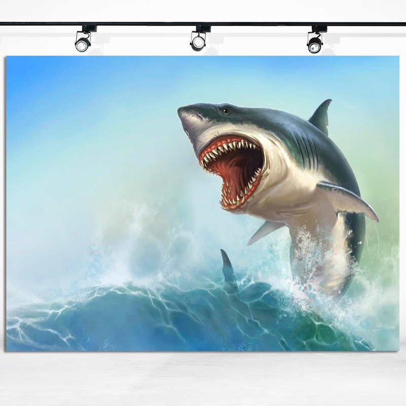 SULLOTSY 7x5ft Fabric Shark Theme Backdrop Blue Ocean Emerging White Shark Animal Photography Background Aquarium Kids Party Decorations Photo Banner Photo Shoot Props