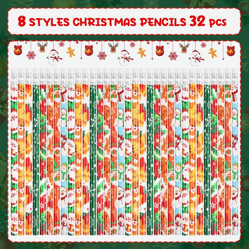 Package Includes: 32 pcs Christmas pencils with eraser in 8 different styles, each style has 4 pieces of pencils