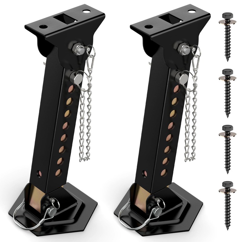- Adjustable Height: Each trailer leveling jack can be adjusted from 12" to 18" and supports up to 1,000 lbs. Plain tops fit most slide-out frames.
