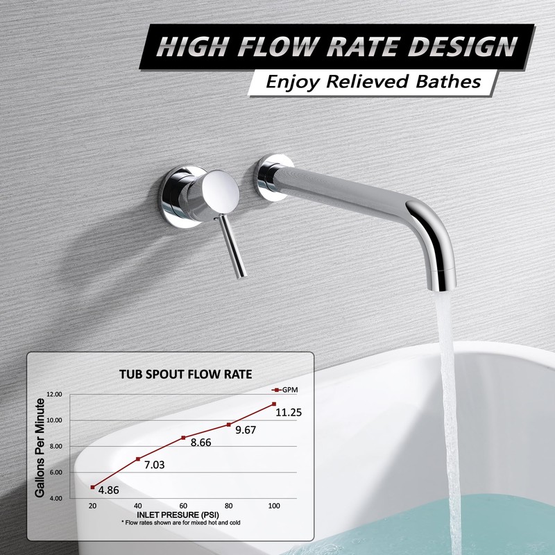 - 5. Spout flow rate is 8.66GPM at 60PSI, this wall mount bathtub faucet can fills up your tub very quickly, you don't need to wait a long time before a bath. To save time and extra expense, please show your plumber the installation video under the main image on product page before installation. Please keep the user manual properly.