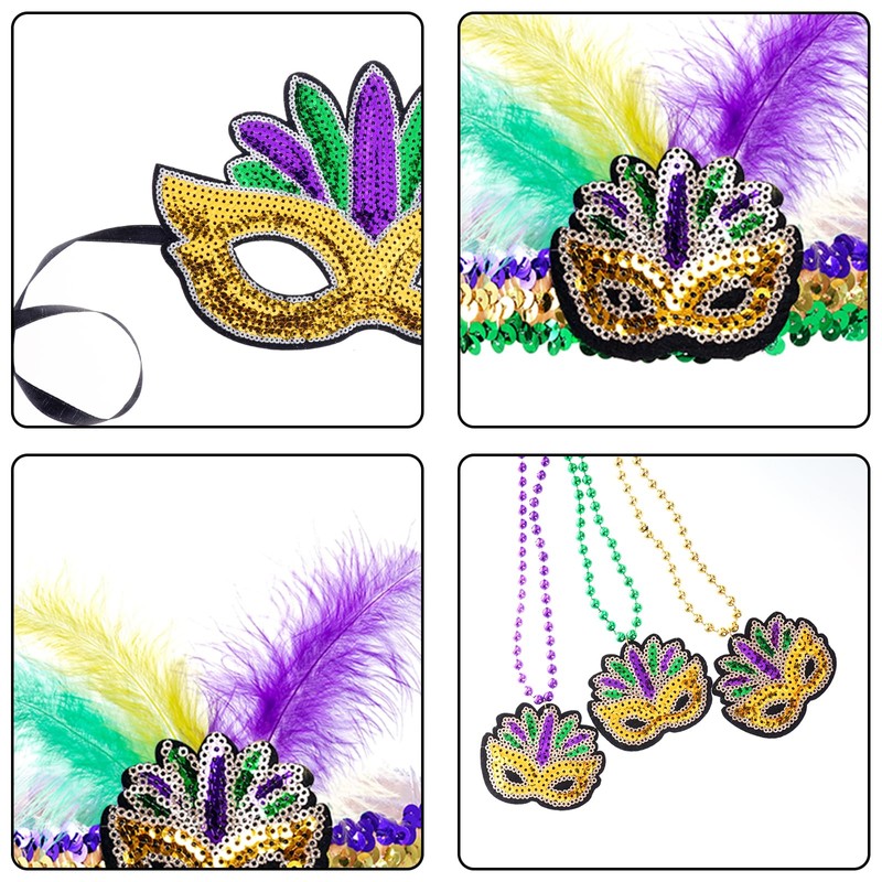 - Stylish Carnival Accessory Pack: From Mysterious mask and Feather Sequin Headband to carnival bead chains necklaces, this set has all the essentials to transform you into the life of the party, making it perfect for Mardi Gras or themed events